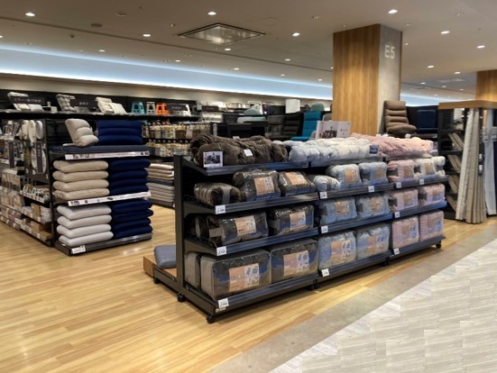 インテリア売場は既存の商品別のレイアウトの枠をこえ、インテリア&ペット、寝具、ワークスペース、リビングスペースが一体となった売場に。大切なペットと過ごすシーンから、テレワークや家族と過ごすシーンまで、あらゆるお部屋のくつろぎ空間づくりの手助けとなる商品を取り揃えています。