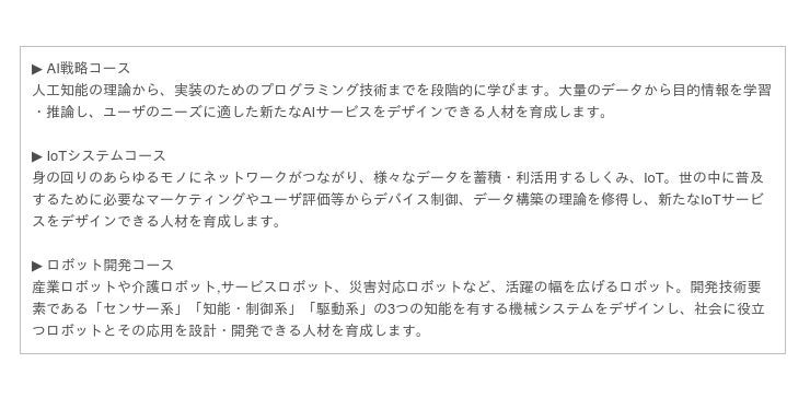 AI、IoT、ロボット、ビッグデータ等の新たな技術を産業や社会に取り入れてイノベーションを創出し、社会的課題の解決を実現する超スマート社会「Society 5.0」の時代に対応する学科。