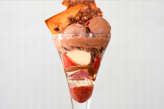 食べ進めていくと、中段にはカカオの果肉”カカオパルプ”にチーズをあわせた、まるでレアチーズケーキのように爽やかながら甘さもあるアイスが登場します。苺や、3ヶ国のカカオ豆を使ったガナッシュクリームと合わせながら、カカオの果肉というチョコレートだけではないカカオの果物としての魅力もご堪能ください。