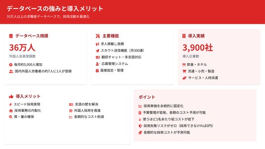 また、しゃべる履歴書や自動翻訳、在留資格チェックなど、外国人採用の不安を解消する機能を標準搭載。日本語を話せる求職者が約8割、職種制限なしが約7割を占める35万人の若手データベースを活用し、コストを抑えながら優秀な外国人材に出会える環境を提供します。