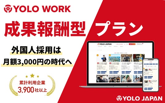 243の国や地域を出身とする35万人以上の在留外国人が登録している日本最大級のメディアを運営する株式会社YOLO JAPAN(代表取締役:加地太祐、大阪本社:大阪市浪速区、以下「YOLO JAPAN」)は、外国人求人掲載サービス「ヨロワーク」において、新しい「成果報酬型プラン」の提供を開始いたしました。