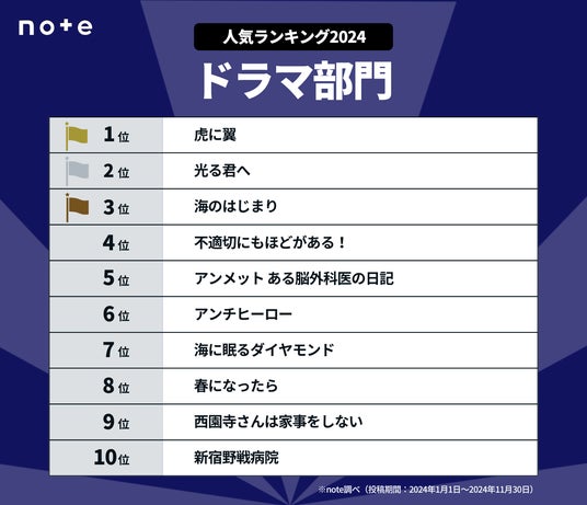 集計方法:note公式お題「#テレビドラマ感想文」と番組名(2024年1月以降に放送開始した作品に限定)のハッシュタグをつけて、期間内に投稿した人数を集計