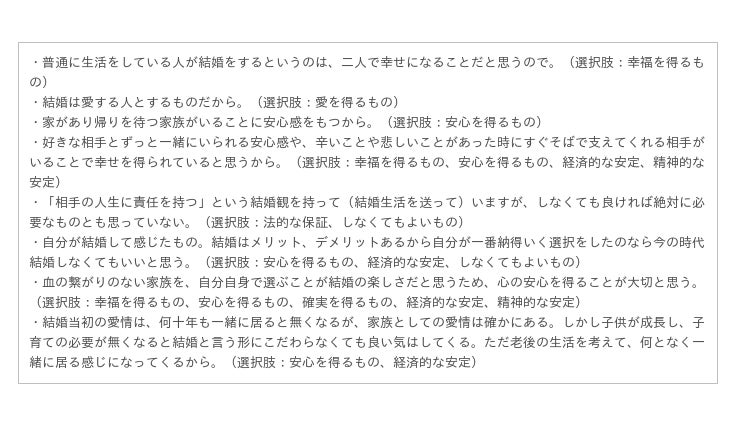 【4】「あなたにとって結婚とは?」1位は「安心を得るもの」、2位は「精神的な安定」。「愛を得るもの」は5位