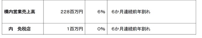 7月の構内営業売上高は、228百万円(対前年比6%)となりました。7月中には、FLIGHT OF DREAMS内BOEING STOREの営業再開や、4連休の便数増加に合わせ営業店舗数が増加傾向にあったことから、前月と比べ売上高が微増となりました。