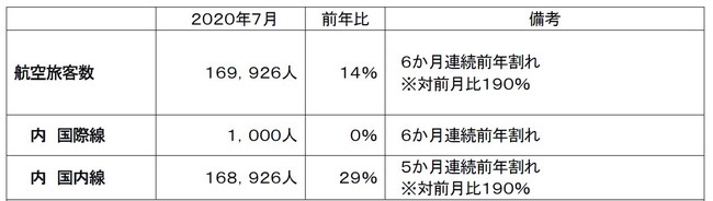 国内線の旅客数は対前年比29%となる168,129人に留まりましたが、7月の4連休前後には国内線便数が増加し、7月1日時点の便数13都市36便から、4連休初日の23日には15都市63便にまで回復しました。8月中も運航再開や増便があったことから、便数の回復が見込まれるとのことです。