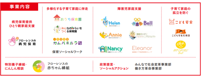 2005年より日本初の共済型・訪問型病児保育事業で仕事と子育ての両立を支援するほか、寄付を原資とした「ひとり親支援病児保育プラン」の提供でひとり親家庭を支える。待機児童問題解決のモデルとして開園した小規模保育所「おうち保育園」に加え、認可保育所と一時保育室を都内・仙台に19施設運営。医療的ケアを日常的に必要とする子ども「医療的ケア児」を専門的に長時間お預かりする日本初の保育園「障害児保育園 ヘレン」を2014年に開園。その後、訪問型や看護サービスも加え障害児家庭を多角的に支援している。
