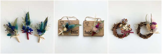 写真中央:エルフェン×ハレハナ Wネーム 壁掛けミニコサージュ