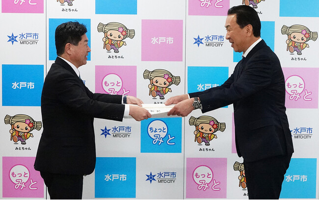 寄贈セレモニーでは、水戸市長 高橋靖様から茨城セキスイハイム株式会社 代表取締役社長 鈴木芳仁様へ感謝状の贈呈が行われました。