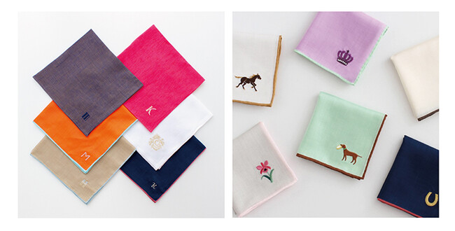 △イニシャル刺繍やモチーフ刺繍の無料券もご用意!イニシャル刺繍は、33書体・20色の糸色からお選びいただけます。他では見つけることのできないオリジナルデザインの刺繍で、特別なハンカチーフをお作りいただけます。