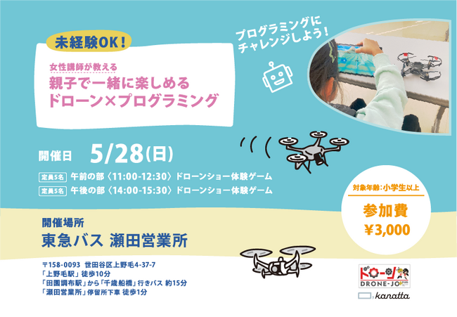 株式会社Kanatta(本社:東京都目黒区、代表取締役社長:井口恵)が運営するコミュニティ・ドローンジョプラスは、2023年5月28日(日)に東急バス株式会社の瀬田営業所にてドローンを活用したプログラミング体験会を開催します。