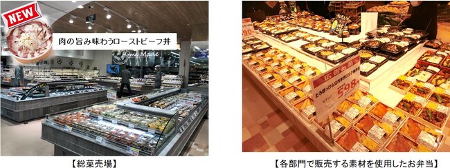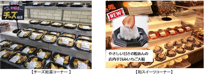 総菜売場では、グラタンやラザニアなどが並ぶ「チーズ総菜コーナー」や新商品の『やさしい甘さの粒あんの店内手包みいちご大福』が並ぶ「和スイーツコーナー」を新設しました。各部門の原料を使用したローストビーフ丼などのお弁当をはじめ、新商品を大幅に増やすとともに売場を拡大しました。