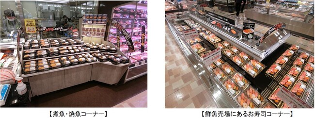 鮮魚・精肉部門の素材を使ったミールキットを新たに品揃し、鮮魚売場では、ヘルシーなお総菜が並ぶ煮魚・焼魚コーナーに加え、お寿司コーナーを充実させました。生魚を使用したおつまみの商品を新規に品揃えし、鮮度の良い商品を豊富に揃えています。以前と同様に、お魚キッチンコーナーではお客様のご要望に合わせた調理を承ります。