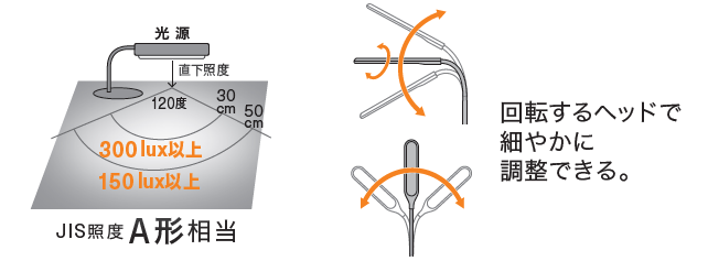 また、フレキシブルアームで様々な方向に動かせるだけでなく、ヘッド部分も回転するので、照射位置と照射角度を変えて、明るくしたい場所に光をうまく当てられて便利です。
