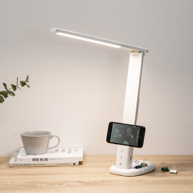 <特徴>明るさ5段階、光の色は3段階調整が可能。スマホスタンドとUSBポートが付いており、充電しながらスマホが見られます。