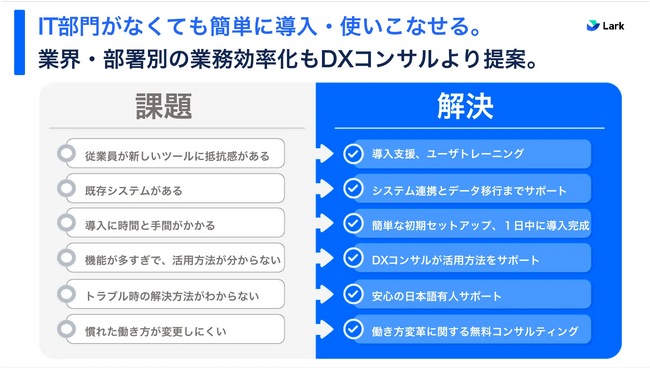 そして、これらの課題に対する明確な解決策として、Larkの導入と実演を通じて実践的なソリューションをご紹介します。さらに、成功事例を通して、現場で直面する問題への具体的な答えを提供します。