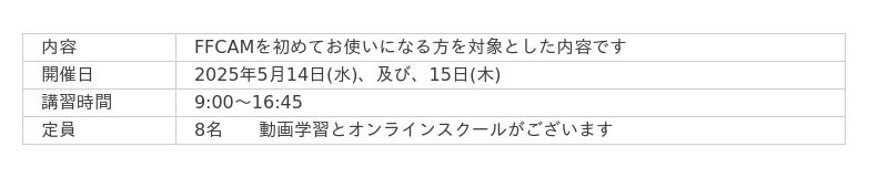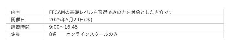 FFCAM(FF/cam、STLCAM、FF/Five)の年間保守契約にご加入のお客様1ライセンスにつき、保守契約期間(1年)中、1名様まで無償でご受講頂けます。