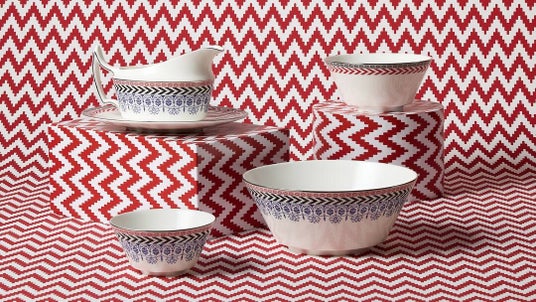 同時に、ウェッジウッドのアーカイブを基にしたボーダー模様に赤のシェブロンラインをアクセントに加えてモダンに仕上げた「フェスティブ」も新登場しました。祝祭(Festive)の名にふさわしい心が躍る華やかさでホリデイシーズンにぴったりでありながら、季節を問わず通年お使いいただけるデザインなのも魅力です。クリスマスギフトや結婚のお祝いの品としておすすめいたします。