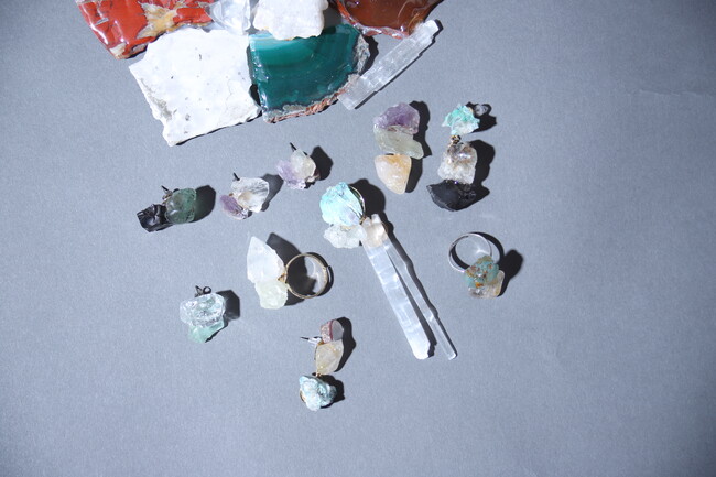 クオーツ、ルチル、フローライト、ルビー、硫黄…など様々な鉱石の欠片を自由に、感覚を研ぎ澄ませ、あなただけのjewelryに仕立てます。2つとして同じものがない絶妙なバランスで組み合わされた鉱石に、好きなパーツやさらに欠片を付け加えて作る、カスタムオーダー会を開催いたします。