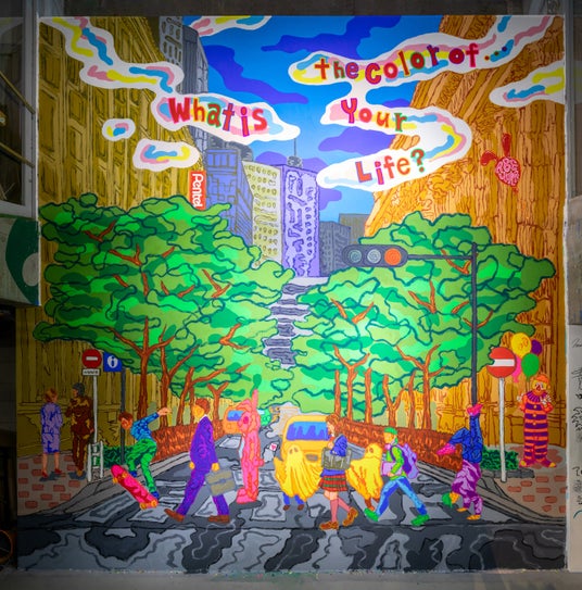 コメント:コメント:「Colors of the City」というテーマを見たとき、「人の人生を描こう」と思いました。街に人が行き交うことで、世界が彩られていくイメージです。普段アーティストとして活動する際は、コンセプトとして自分の考えや主張が重要視されますが、今回は大勢の方が携わるプロジェクトということもあり、「ABEYUKA.の良さはそのままに、沢山の人に愛される作品」を作ることを目標としました。大きな壁画制作も、ぺんてるの社員さんたちが入れ代わり立ち代わり制作をお手伝いしてくださることも、私にとって初の試みでしたので、事前に綿密に作戦を練り制作に取り掛かりました。おかげさまで計画通り丸5日間で完成させることができ、とても嬉しく思います。