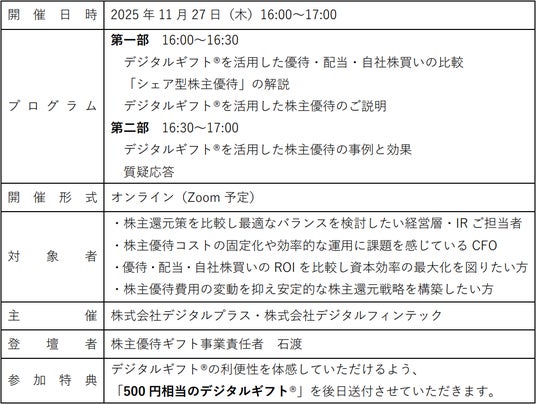 株主還元策は、企業価値向上のための重要テーマであり、個人投資家との信頼構築に直結します。一方で、従来の株主優待では、株主数の増加に伴い想定外の優待還元額が発生し、結果的に内容変更や制度廃止に至るケースも見られます。こうした課題を踏まえ、本ウェビナーでは、企業側が優待還元額を事前に固定化できる新しい仕組み「シェア型株主優待」について分かりやすく徹底解説いたします。