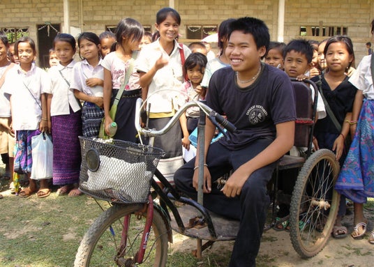 ラオスの地方部では公共交通機関が障がい者向けに整備されておらず、障がいのある人の外出はとても困難です。移動手段が限られることで、特に立場の弱い女性や学齢期の子どもは学校や社会とのつながりも制限されてしまいます。女性や子どもでも軽い力で動かせる改良型の手漕ぎ三輪車を開発・製造し、下肢に障がいのある41人に提供します。