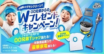オキシクリーン公式Xをフォロー&対象投稿をリポストすると「チョコプラ直筆サイン入りOO兄弟 Tシャツ」が10名様に、また対象商品を購入してキャンペーンサイトより応募すると豪華家電が28名様に抽せんで当たる『大掃除にはオキシクリーン!OO兄弟からのWプレゼントキャンペーン』を実施中です。