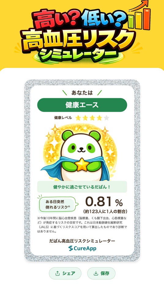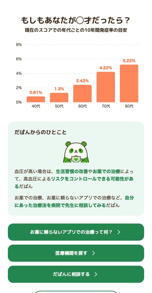 株式会社CureApp(キュア・アップ / 本社:東京都中央区 代表取締役社長:佐竹 晃太以下、当社)は、高血圧お役立ちLINE「だぱん」に、現在の血圧や年齢、生活習慣などから将来の脳心血管疾患のリスク目安を表示する新コンテンツを追加しました。10年間で脳心血管疾患で突然倒れるリスクをパーセンテージで表示し、生活改善や高血圧治療への動機づけを行います。登録・利用は無料です。