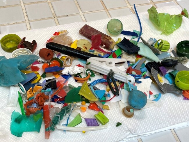 私は数年前から「地球のために自分のできることからはじめていこう」と思い、家の前の海で片手にサーフボードを持ちながらもう片方の手でゴミを拾ったり、犬の散歩をしつつ気づいたゴミを拾ったりしながら、そのゴミをアート作品にできないかと考えつきました。