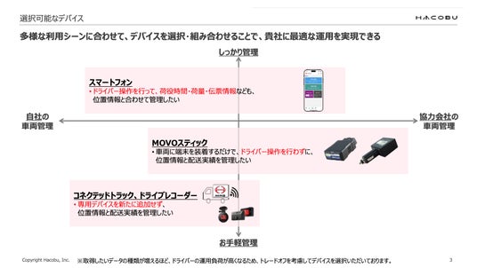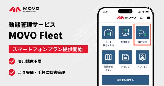 データの力で物流課題を解決する株式会社Hacobu(ハコブ、本社:東京都港区、代表取締役社長CEO 佐々木太郎、以下「Hacobu」)は、スマートフォンで取得したGPSを用いて動態管理サービス「MOVO Fleet(ムーボ・フリート)」を利用できるプランの提供を、11月28日より開始しました。これにより、業務用のスマートフォンをドライバーへ支給している場合は、以前よりも安価かつ手軽にMOVO Fleetをご利用いただけるようになります。