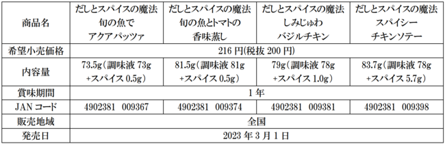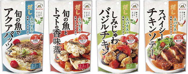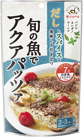 株式会社にんべん(東京都中央区、代表取締役社長 高津伊兵衛)は、「だしとスパイスの魔法」シリーズをリニューアルし、「旬の魚でアクアパッツァ」「旬の魚とトマトの香味蒸し」「しみじゅわバジルチキン」「スパイシーチキンソテー」を2023年3月1日(水)より全国で新発売いたします。
