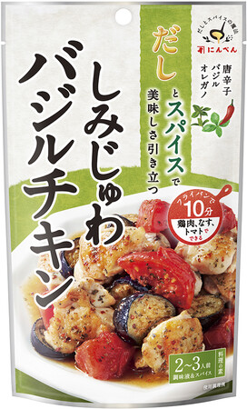 鰹節だしのうま味としょうゆの風味にバジル・オレガノをあわせた、和洋折衷のおいしさのバジルチキンの素です。