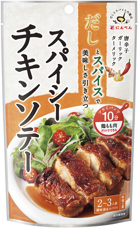 鰹節のうま味を効かせたしょうゆベースのたれに、8種のスパイスをブレンドした、「スパイシーチキンソテー」用調味液です。