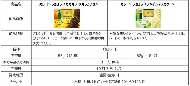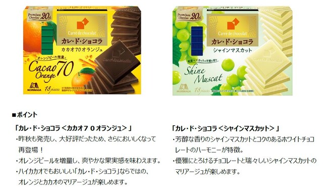 森永製菓株式会社(東京都港区芝、代表取締役社長・太田 栄二郎)は、今年で発売20周年を迎え、味わい・香り・口どけにこだわった本格的なチョコレート「カレ・ド・ショコラ」ブランドから、「カレ・ド・ショコラ<カカオ70オランジュ>」「カレ・ド・ショコラ<シャインマスカット>」を10月3日(火)より新発売いたします。