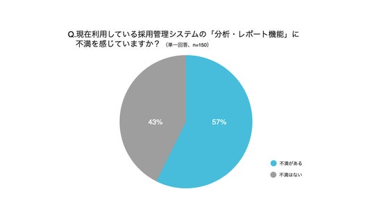 採用活動の評価で必要なデータは、企業によって異なります。しかし、従来の採用管理システムのレポート機能では、限定的な分析しか行うことができず、企業ごとに必要なデータの集計・分析をするためには、CSVをエクスポートし、表計算ソフトで加工する必要がありました。当社が2024年10月~2025年4月に、採用管理システムを利用中の150社を対象に実施した聞き取り調査では、57%が「分析やレポート機能に不満がある」と回答しています。