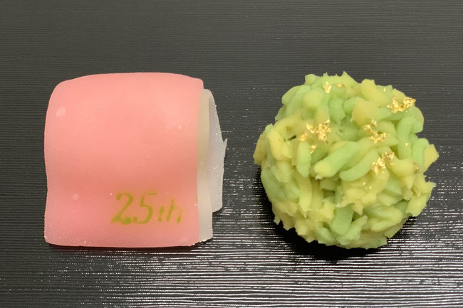 外郎製の誰が袖型黄色あんと、きんとん製こしあんを詰め合わせた25周年用にあしらえた生菓子です。