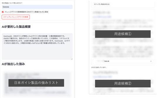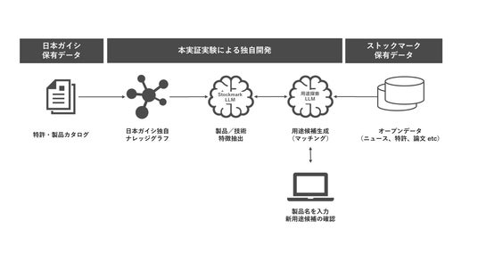 本実証実験は、ストックマークが開発したビジネス領域に強い独自日本語LLM(Large Language Model)「Stockmark-LLM」をはじめとしたLLMの活用に加え、日本ガイシの製品カタログや技術情報などの保有資産(シーズ)から作成したナレッジグラフを用いることで、外部情報の関係性を正確かつ高速で結びつけることが可能となり、保有製品や技術の新たな展開先(ニーズ)を、属人的なスキルや経験に頼ることなく生成AIが提案する仕組みの構築を目指しています。