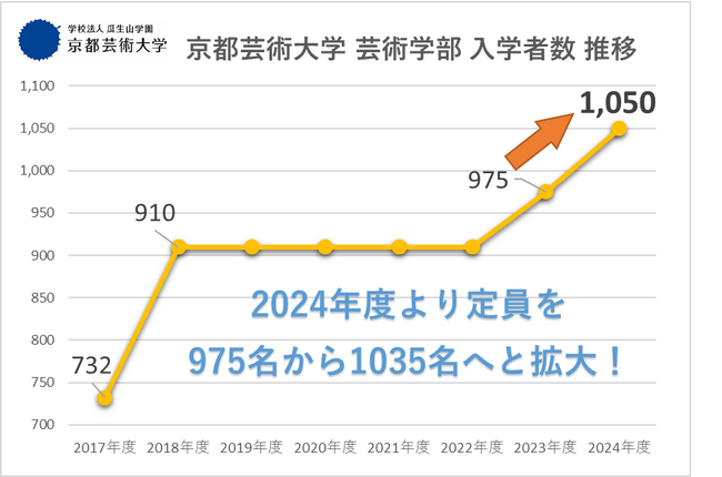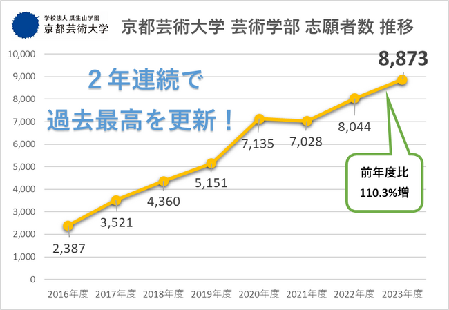 学校法人瓜生山学園 京都芸術大学(京都市左京区/学長 吉川左紀子)の令和5年度(2023年度)入試における通学部の前年度の8,044名からさらに増加し、8,873名(前年対比+829名、110.3%増)となりました。高まる受験ニーズに応えるため、2024年度より定員を975名から1,035名へと拡大し、新たな学びの場として「ゲームクリエイションコース」と「映像クリエイションコース」を情報デザイン学科に設置します。