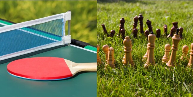 芝生広場で楽しむ様々な遊具をそろえています。卓球台やシーソーベンチなどの遊具のほか、レンタルして使える屋外チェスなどもご用意。