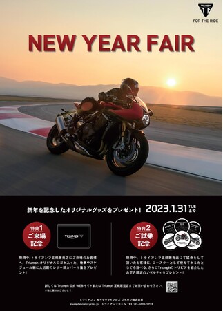 トライアンフモーターサイクルズジャパン株式会社(本社:東京都港区海岸 代表取締役社長:大貫陽介)は新年1月7日 より、全国のトライアンフ正規販売店において2023年の幕開けを飾る、「New Year Fair」を開催することをお伝えいたします。