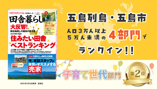 五島列島・五島市(長崎県)は、宝島社『田舎暮らしの本』2月号、「2024年版 住みたい田舎ベストランキング』人口3万人以上5万人未満の市の4部門でランクイン!なかでも子育て世代部門は第2位という結果になりました。