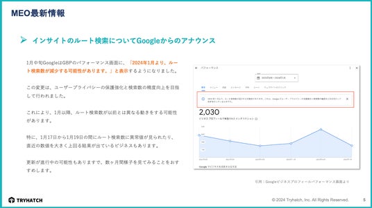 株式会社ベクトル(本社:東京都港区、代表取締役会長兼社長:西江 肇司、東証プライム:6058)の子会社である株式会社トライハッチ(東京都新宿区、代表取締役社長、武藤 尭行、以下「当社」)は、独自開発している店舗向けデジタルマーケティングツール「MEOチェキ」を活用して、MEOのアルゴリズム調査やトレンドをまとめた「MEOトレンドレポート」の2024年1月版を無料公開致しました。