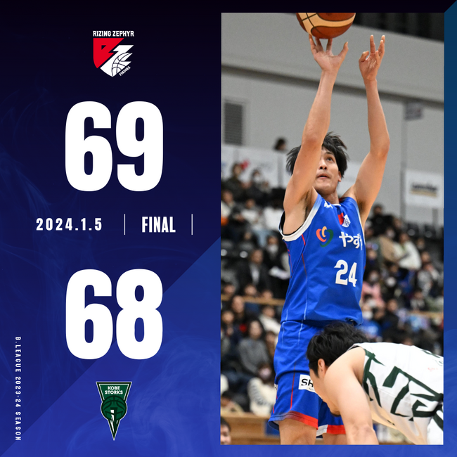 2024年1月5日(金)に開催されました【ライジングゼファーフクオカvs.神戸ストークス】において“福岡69-68神戸”の結果となりましたことお知らせいたします。