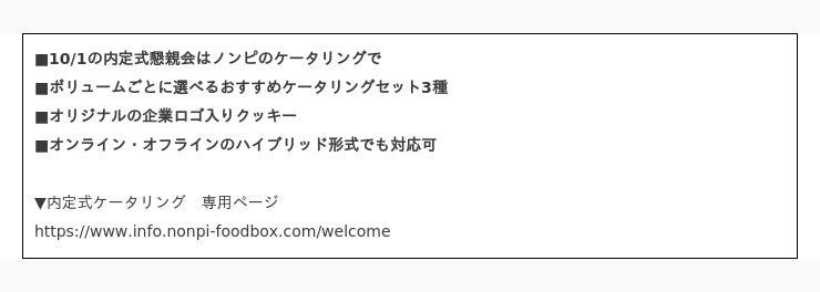 ノンピは、国内最大級ケータリングサービスとして例年内定式でのケータリング注文を多くいただいています。昨年まではオンライン形式での開催も多く、内定者の自宅に料理と飲み物をセットにしたフードボックスは2020年のサービス開始から現在までで累計約95万人にお届けしました。