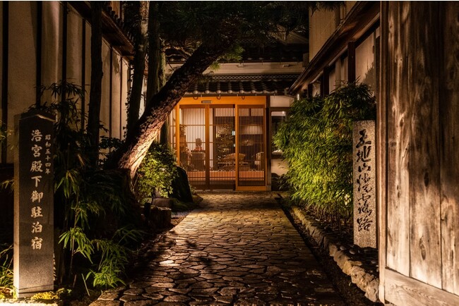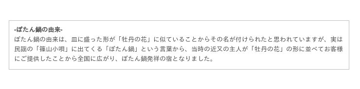 また、昭和54年11月現令和天皇、浩宮徳仁親王殿下にも御宿泊を賜り、当館のぼたん鍋をご賞味いただいております。春、夏は地元の食材をふんだんに取り入れた会席料理を、秋は松茸会席を、そして冬はぼたん鍋と四季折々のお料理お召し上がりいただける、歴史ある料理旅館です。