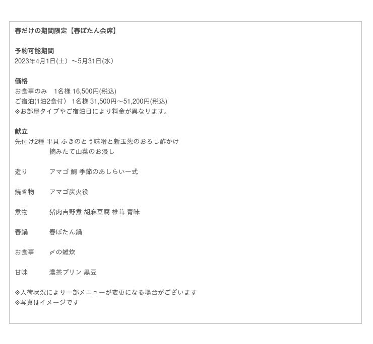 GLION GROUP(本社:兵庫県神戸市中央区)が運営する株式会社近又(所在地:兵庫県丹波篠山市)は、2023年4月1日(土)より春ぼたん会席の販売を開始致します。