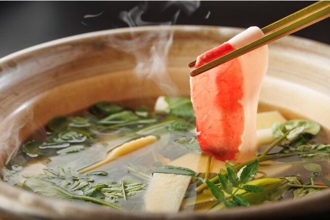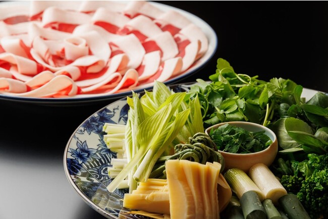 この度の春のぼたん鍋では、根菜類と合わせていた冬ぼたんとは少し違い、山椒の効いた特製出汁とたっぷりのクレソン、筍、芹、三つ葉、うど、木の芽など丹波篠山産の瑞々しい野菜と共にお召し上がり頂きます。