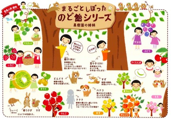 「まるごとしぼったのど飴」シリーズは、季節の果物をまるごとしぼった果汁を使ったメントール不使用のおいしいのど飴です。のどにやさしいハーブエキス入りで「まるしぼり」果汁を使用したジューシーなおいしさが楽しめるため、のど飴においしさとやさしさを求める方におすすめです。また「まるしぼ果樹園」のしっかり者の長女・朝子と、おっとり者の次女・菜々子を描いた絵本のようなほんわかした世界観がお客様にご好評をいただいています。