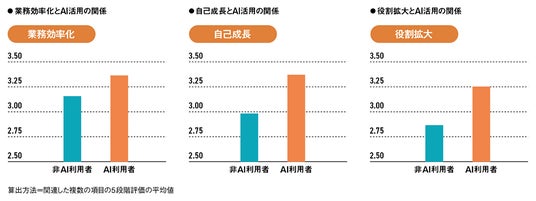 また、AIの活用は社員の意識にも影響することが分かりました。仕事でAIを活用する社員はそうでない社員に比べて業務効率化を実感しており、さらに自己成長、役割拡大などについてもAIの利用者が非利用者を上回りました(下のグラフ参照)。こうした社員の意識におけるポジティブな効果を引き出すためにも、先に挙げた条件に留意することが企業のAI活用にとり重要であることを示しています。