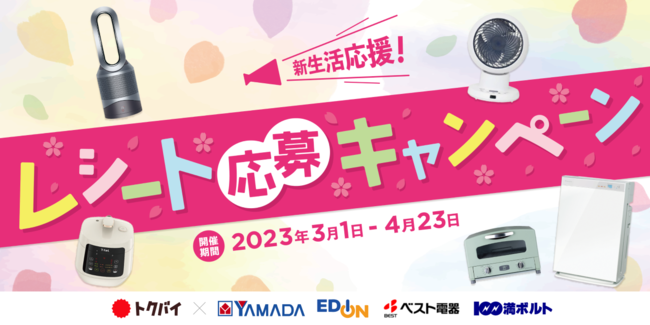 くふうカンパニーグループにおいて、チラシ・買い物情報サービス「トクバイ」を運営する株式会社ロコガイド(以下「ロコガイド」)は、家電量販店「ヤマダデンキ」「エディオン」「ベスト電器」「100満ボルト」計4社と合同で、「新生活応援!家電量販店合同レシート応募キャンペーン」を2023年3月1日(水)~ 2023年4月23日(日)の期間で開催します。