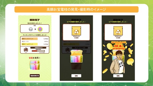 ・概要:高額お宝電柱はピクトレ上で発見して撮影することで通常の電柱よりもはるかに高額の報酬を獲得することができる特別な電柱です。高額お宝電柱を撮影すると、「レインボー宝箱」が出現し、その宝箱から高額報酬(第1弾は10万円相当の暗号資産DEAPcoin(DEP)の引換券)が排出されます。